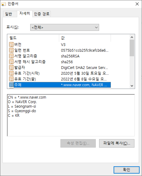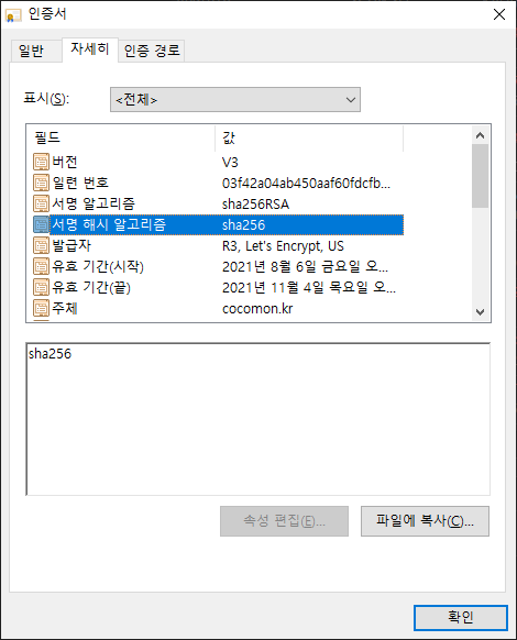 알고리즘이 sha256으로 네이버에서 사용하는 알고리즘과 동일한 것을 확인할 수 있습니다. 보안 레벨은 동일하다는 것을 알수 있겠죠?