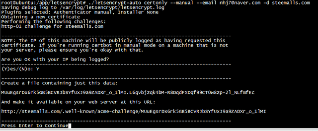 Press Enter to Continue Waiting for verification… Cleaning up challenges IMPORTANT NOTES: - Congratulations! Your certificate and chain have been saved at: /etc/letsencrypt/live/steemalls.com/fullchain.pem Your key file has been saved at: /etc/letsencrypt/live/steemalls.com/privkey.pem Your cert will expire on 2018-02-16. To obtain a new or tweaked version of this certificate in the future, simply run letsencrypt-auto again. To non-interactively renew *all* of your certificates, run “letsencrypt-auto renew” - If you like Certbot, please consider supporting our work by: Donating to ISRG / Let’s Encrypt: https://letsencrypt.org/donate Donating to EFF: https://eff.org/donate-le