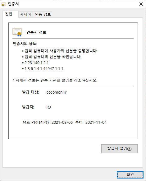 네 둘다 알고리즘이 sha256으로 동일하다는 것을 알수 있었습니다. 무료라고 무시하거나 불안해하실 필요가 전혀 없다는 이야기입니다. 사실 우리가 운영하는 블로그나 개인 사이트들에 굳이 https를 적용할 필요는 없지만 사이트의 신뢰도를 높이기 위해서겠죠.