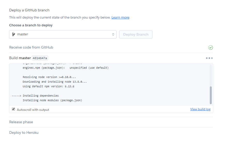 Deploy Branch 하면 빌드 로그가 보임