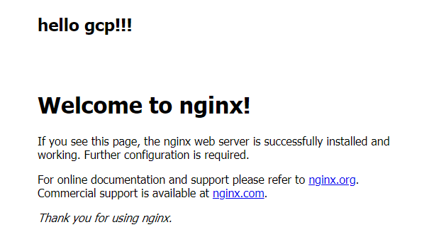 다시 해당 아이피로 접속하면~ hello gcp!!!가 보이는 것을 정상적으로 확인했습니다.
