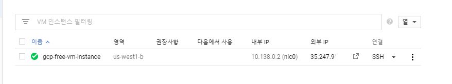 잠시 기다렸더니 저렇게 인스턴스가 만들어진 것을 확인했습니다. 바로 SSH 연결을 눌러서 접속해보겠습니다.