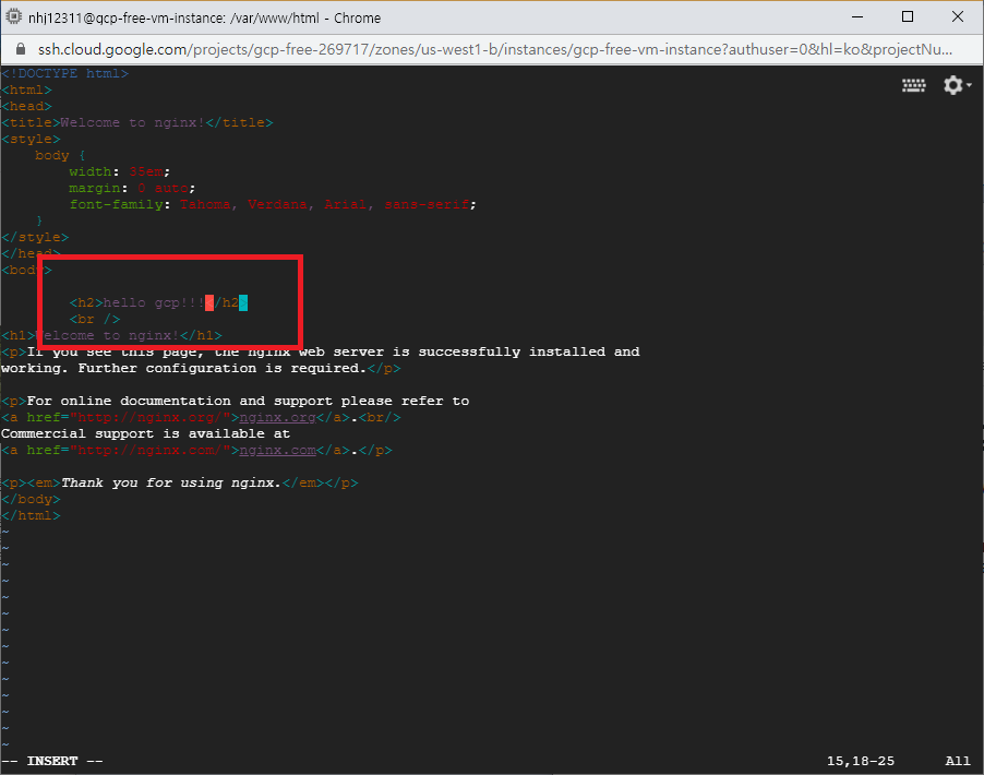 $ sudo vi index.nginx-debian.html VI에서 hello gcp!!! 를 입력해줍니다.
