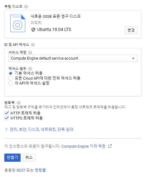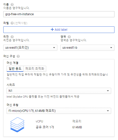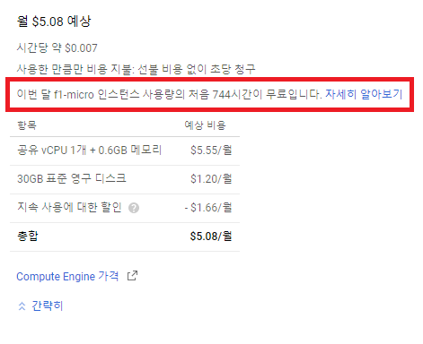 그리고 머신 유형은 f1-micro(vCPU 1개, 614MB 메모리)를 선택하면 됩니다.