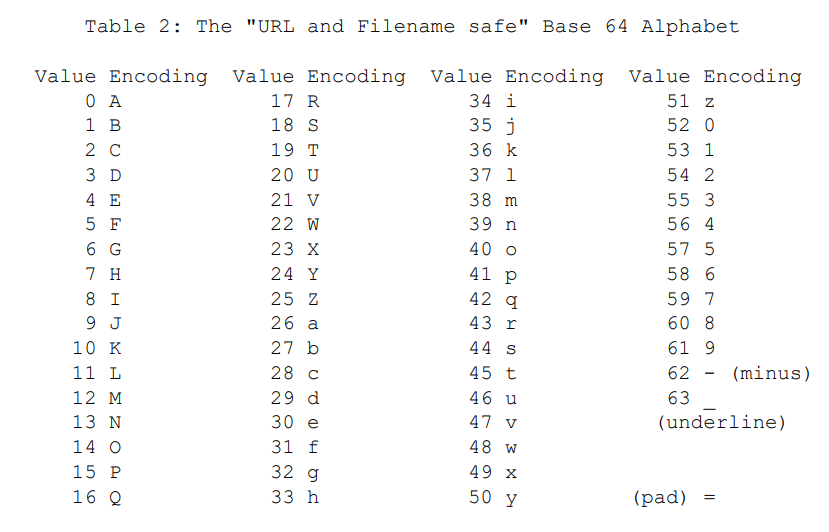 여기서 62번째인 +와 63번째인 / 기호를 각각 -(minus)와 _ (underline) 으로 바꾸게 되면 Base 64의 URL and Filename safe 버전이 됩니다. 그러니까 Base64를 이용해도 +와 /를 -,_로 치환하게 되면 URL이나 파일명으로도 사용할 수 있게 된다는 뜻이죠.