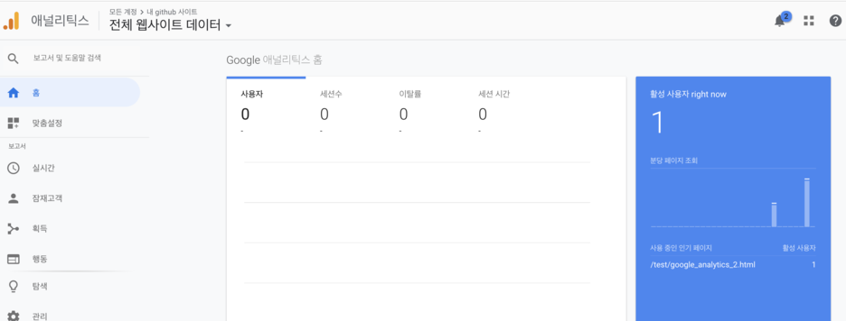 </html>이렇게 gtag 스크립트를 적용한 다음 애널리틱스 홈을 접속한 다음 사이트에 접속해봅니다.