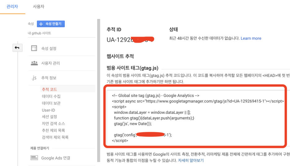 그러면 바로 추적 ID가 나오며 범용 사이트 태그(gtag.js) 스크립트가 나오는데 이 부분을 운영 중인 사이트에 붙여넣게 되면 끝이 납니다. 물론 그냥 붙여넣는게 아니라 모든 페이지에 붙여넣어야 합니다. 즉 보통 개발자들이 공통 스크립트 단에 삽입을 하게 됩니다.