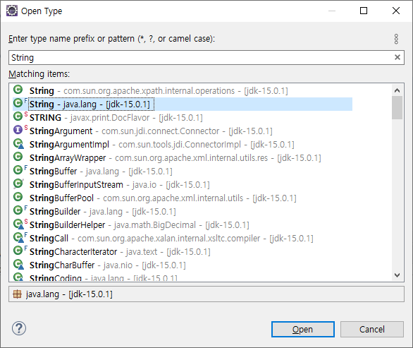 jar 내에 있는 클래스까지 찾아주기 때문에 어떤 jar에 있는지 일일이 찾을 필요가 없게 됩니다. 각종 디컴파일 도구 없이도 클래스를 찾아볼때 유용한듯 합니다. 저도 항상 Ctrl+Shift+R 로 거의 많이 찾는 편이었는데요. 이거보고 클래스 찾을 땐 Ctrl+Shift+T를 써야겠단 생각을 함;;