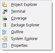 여기 나오는 Project Explorer, Terminal, Coverage, Package Explorer, Outline, System Explorer, Properties는 자주 쓰는 메뉴이지만 빠르게 접근이 안되는 메뉴들이기도 합니다. 해당 단축키, Alt+Shift+W를 사용하면 빠르게 접근 할 수 있습니다.