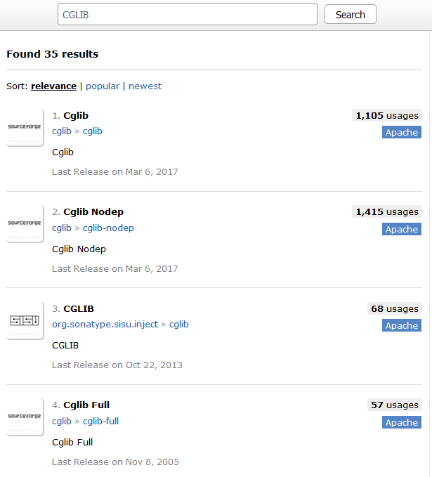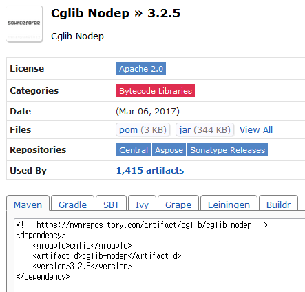 먼저 CGLIB를 임포트합니다. 가장 최근 버전이 3.2.5 버전이군요. 저 같은 경우 항상 임포트를 할 때는 https://mvnrepository.com에서 검색을 해서 찾습니다.
