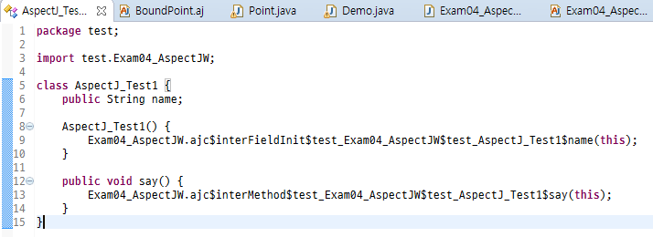 }Exam04_AspectJW.aj 내에서 AspectJ_Test1의 필드와 함수를 선언하고 있다. 컴파일된 class 파일을 디컴파일해서 열어봤다.