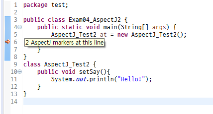 }실제로 이런 코딩으로 aspectJ를 적용하면 AJDT가 적용된 경우 이클립스에서는 화살표로 advides 표시를 보여준다.