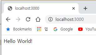 app.listen(port, () => console.log(`Example app listening on port ${port}!`))이렇게 만들었으면 일단 내 피씨에서 실행해서 확인해봅시다. 포트는 3000 이니까 cmd에서 node app.js로 실행한 다음 http://localhost:3000 로 접속하면