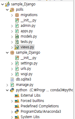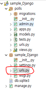 ]그 다음 최상위 urls에서 polls.urls를 연결해주면 끝. 내 프로젝트 기준으로 sample_Django.urls.py 에서 polls.urls.py를 연결해주면 되는 걸로 생각된다.