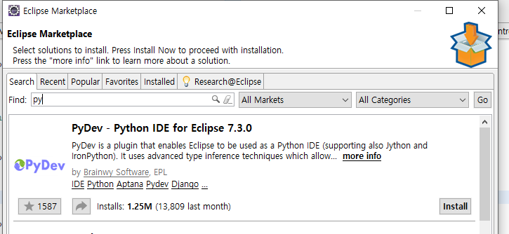 이클립스 마켓 플레이스에서 py를 검색하면 PyDev가 검색 된다. 걍 바로 설치해보자.
